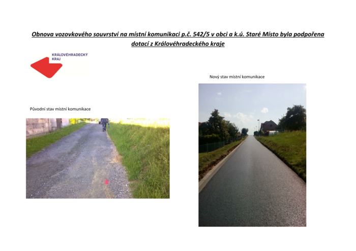 Obnova vozovkového souvrství na místní komunikaci p.č. 542/5 v obci a k.ú. Staré Místo byla podpořena dotací z Královéhradeckého kraje
