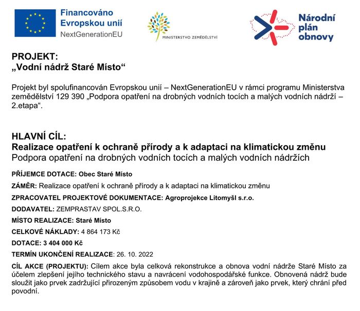 Úvod > O obci > Granty a dotace > Vodní nádrž Staré Místo